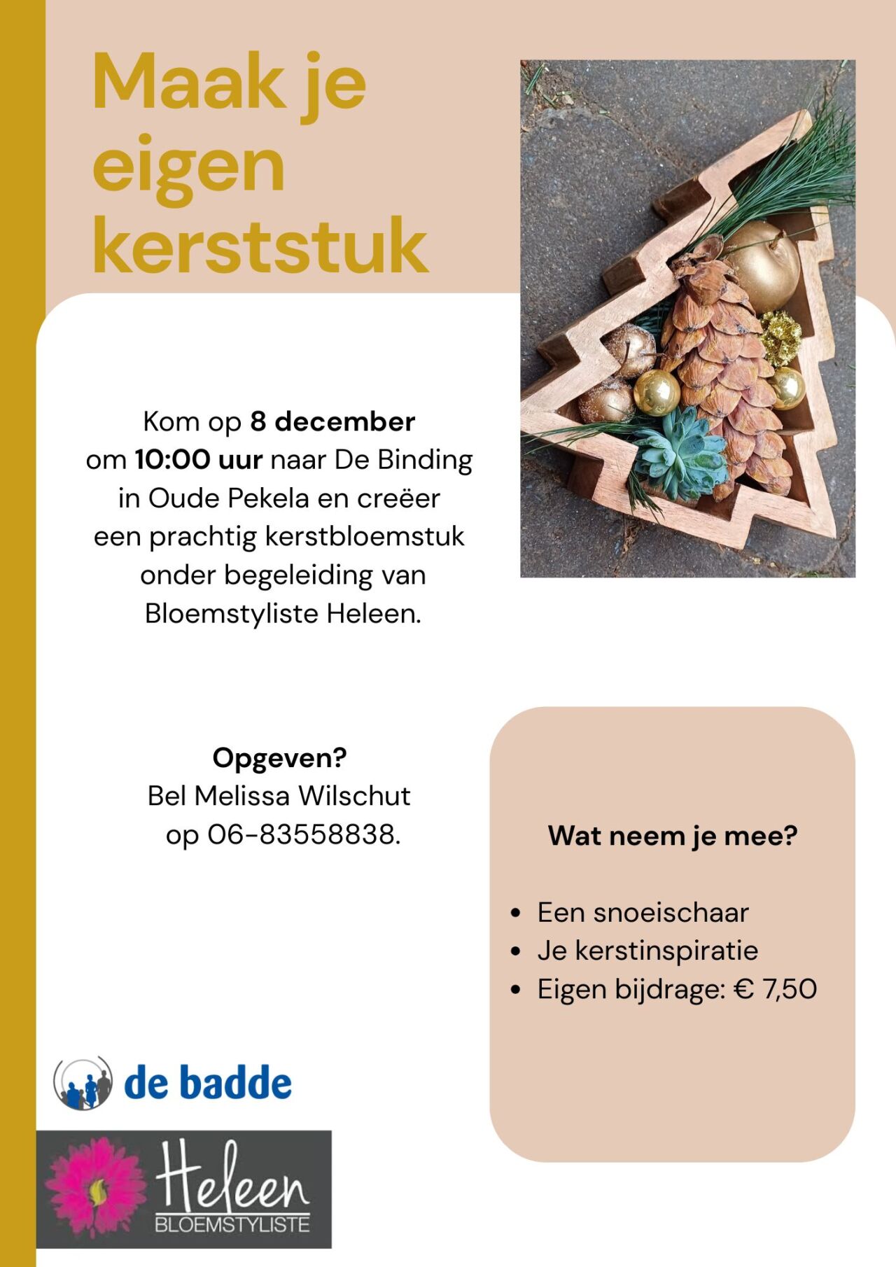 Kom op 8 december om 10:00 uur naar De Binding in Oude Pekela en creëer een prachtig kerstbloemstuk onder begeleiding van Bloemstyliste Heleen