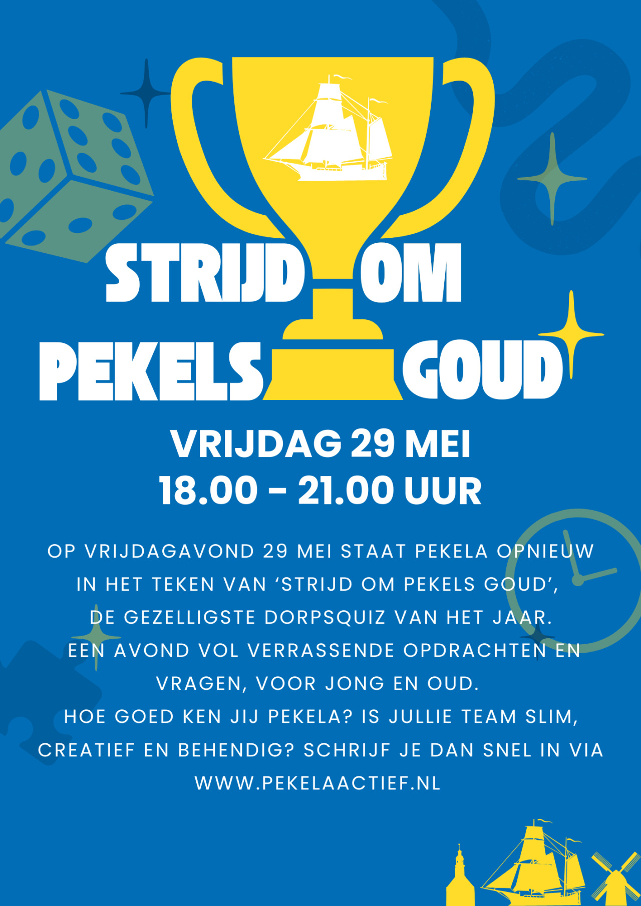 Op vrijdagavond 29 mei staat Pekela opnieuw in het teken van Strijd om Pekels Goud, de gezelligste dorpsquiz van het jaar. Een avond vol verrassende opdrachten en vragen over en in Pekela en omgeving, voor jong en oud. Hoe goed ken jij Pekela? Is jullie team slim, creatief en behendig? Teams van gezinnen, vrienden of sportclubs kunnen zich vanaf nu weer inschrijven.