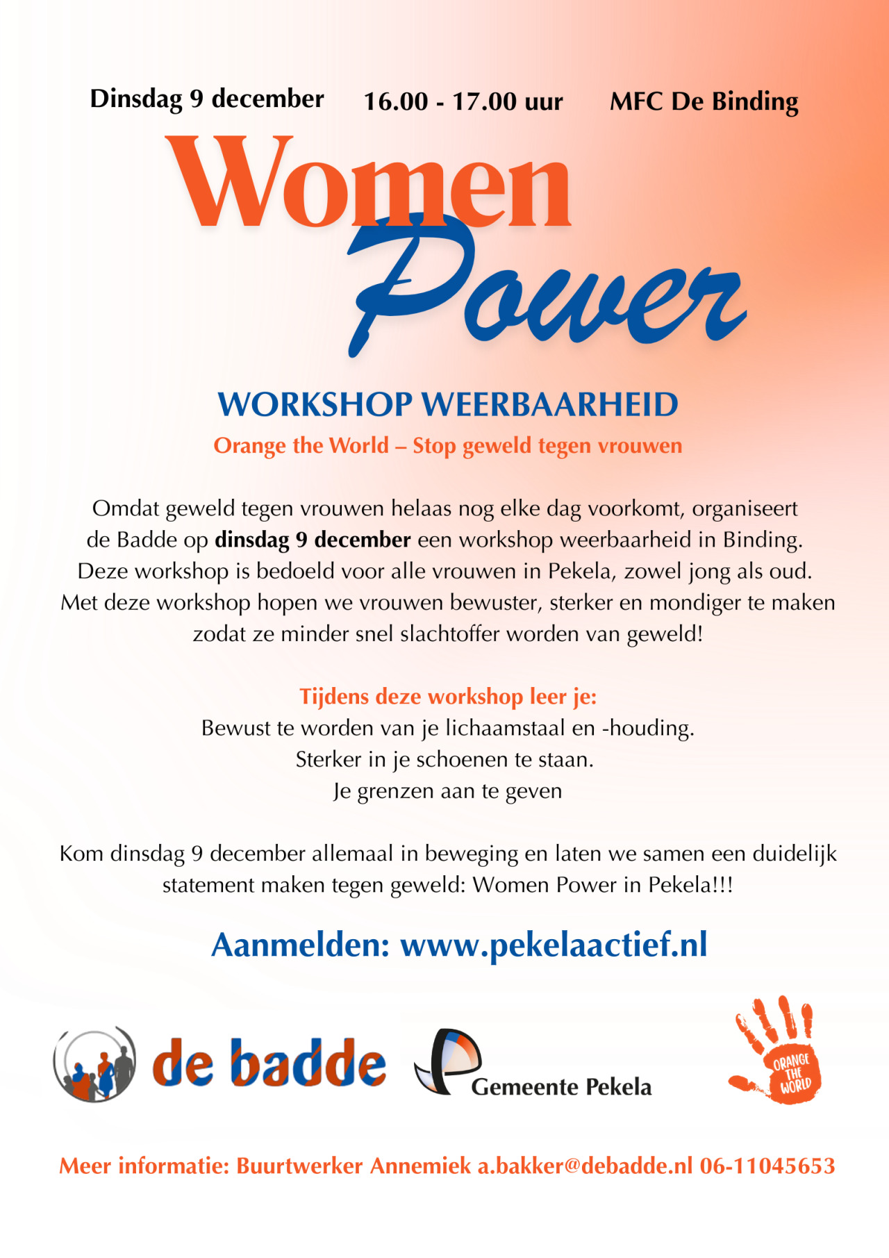 Omdat geweld tegen vrouwen helaas nog elke dag voorkomt, organiseert de Badde op dinsdag 9 december een workshop weerbaarheid in Binding. Deze workshop is bedoeld voor alle vrouwen in Pekela, zowel jong als oud.